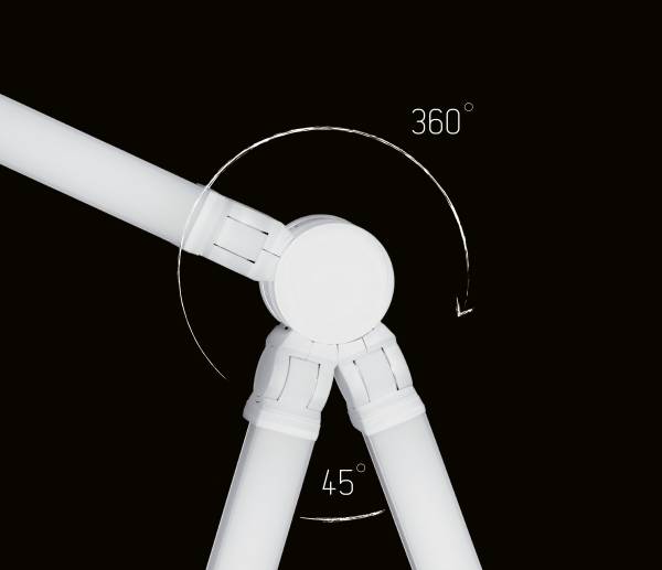 Each LIGEO™ fixture can rotate 360 degrees around each hub. The hinges at each end of the fixture are tapered to allow 45 degrees of separation.